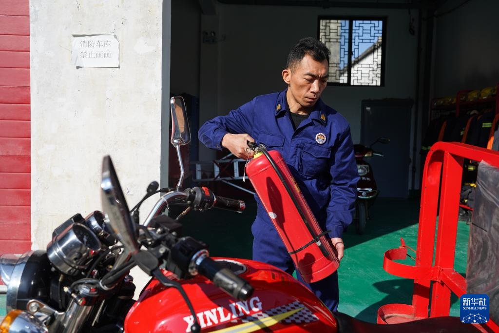 12月19日,舒建军在宏村镇专职消防队车库前检查灭火器。
