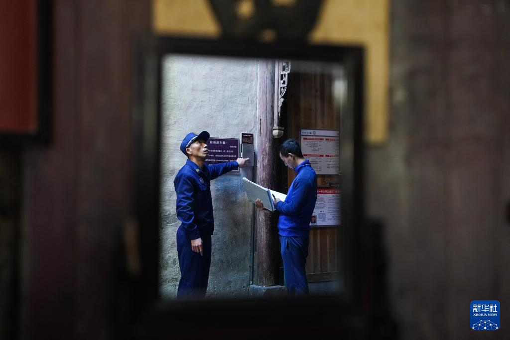 12月19日,舒建军(左)与同事谢晓强在宏村一处古民居内检查消防报警设备。