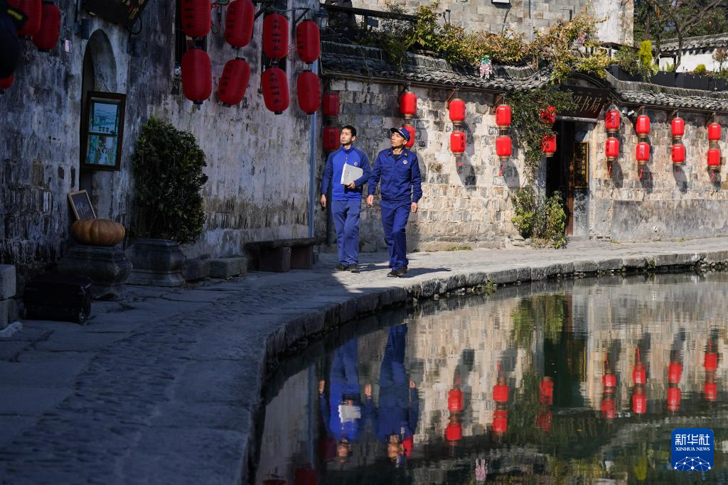 12月19日,舒建军(左二)与同事谢晓强在宏村中巡逻。