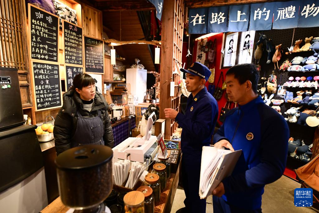 12月19日,舒建军(中)与同事谢晓强在宏村一处商店内向店员普及消防知识。