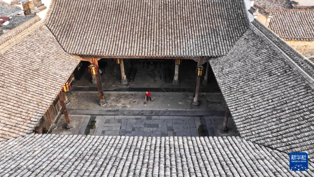 12月18日,胡晓雯在西递村敬爱堂内打扫卫生(无人机照片)。