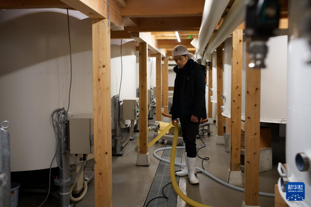 12月16日,常山晋平在日本福井县的常山酒厂酿造间等待酒醪通过管道进入过滤器。