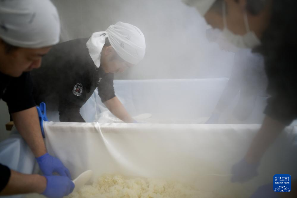 12月17日,在日本福井县常山酒厂,工人将刚蒸好的米装篮称重。
