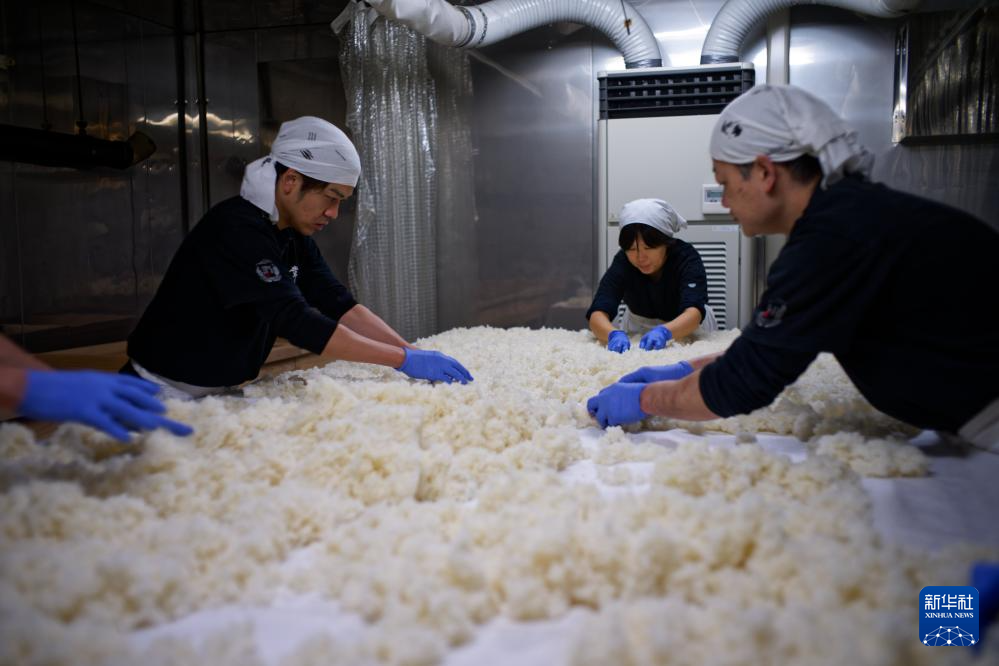 12月17日,在日本福井县,常山酒厂第九代继承人、总经理兼酿造责任人常山晋平(左二)和工人将米麹菌撒在蒸米表面。