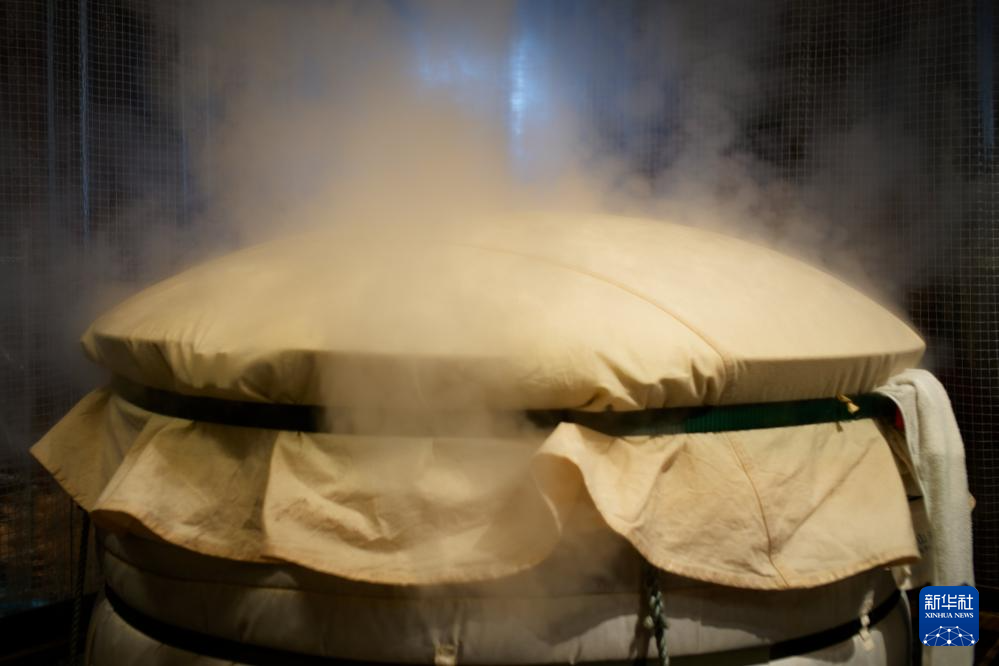 12月17日,在日本福井县常山酒厂,洗好的米被放入蒸笼中蒸熟。