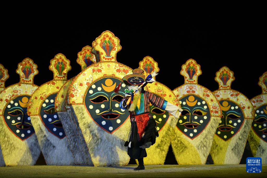 2021年4月10日,演员在大型实景剧《文成公主》中表演藏戏片段。拉萨布制面具制作技艺西藏自治区级非遗传承人西洛创办的拉萨市达孜区雪乡扎西岗传统手工艺合作社多次为该剧提供道具支持。
