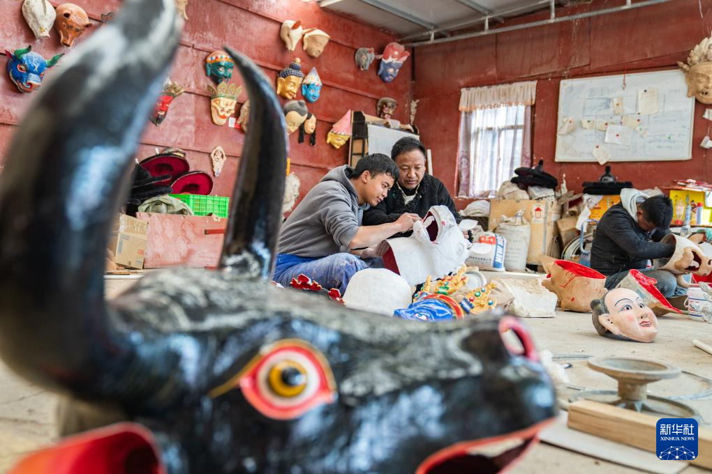 12月9日,拉萨布制面具制作技艺西藏自治区级非遗传承人西洛(中)和同事一起制作西藏传统面具。西洛是拉萨布制面具制作技艺的西藏自治区级非遗传承人,他制作的面具广泛运用于藏戏表演中。2012年,在政府的扶持下,西洛创办了拉萨市达孜区雪乡扎西岗传统手工艺合作社。近年来,合作社不断吸纳当地群众学习面具制作技艺,不仅为当地群众提供就业机会,同时也助力非物质文化遗产的保护和发展。