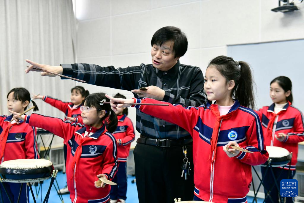 12月30日,在惠民县胡集镇第一小学,老师指导学生学习西河大鼓。