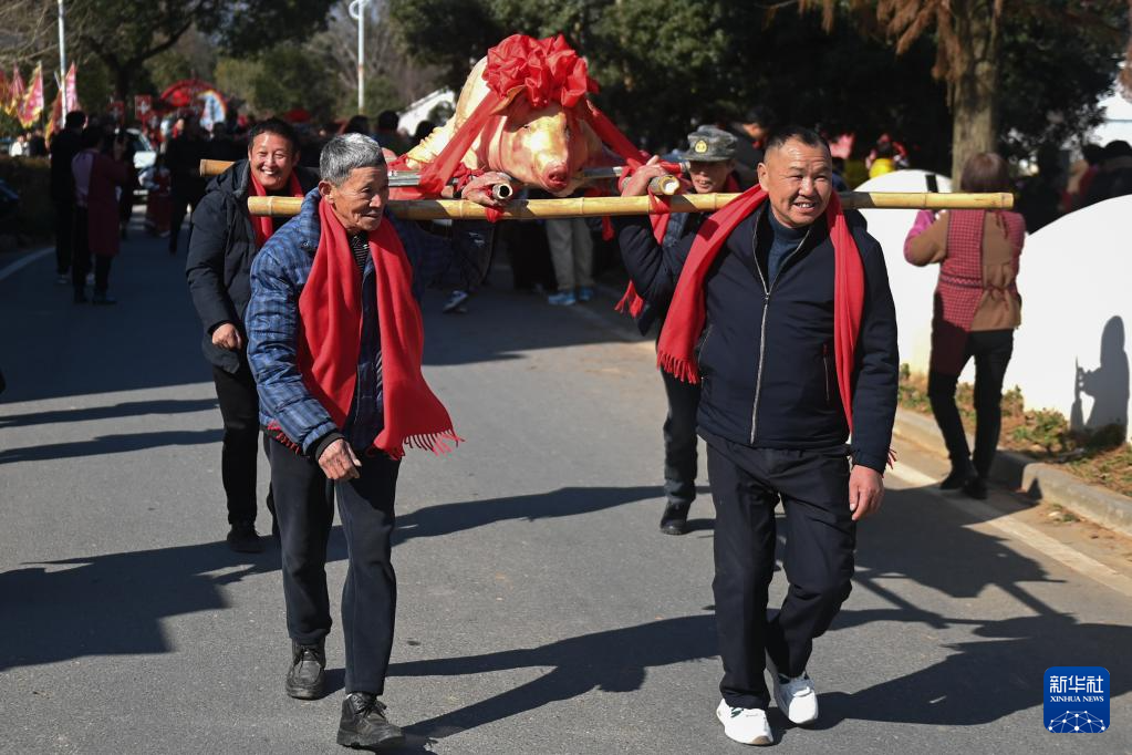 12月29日,妙西镇龙山村村民抬着年猪在村庄巡游。