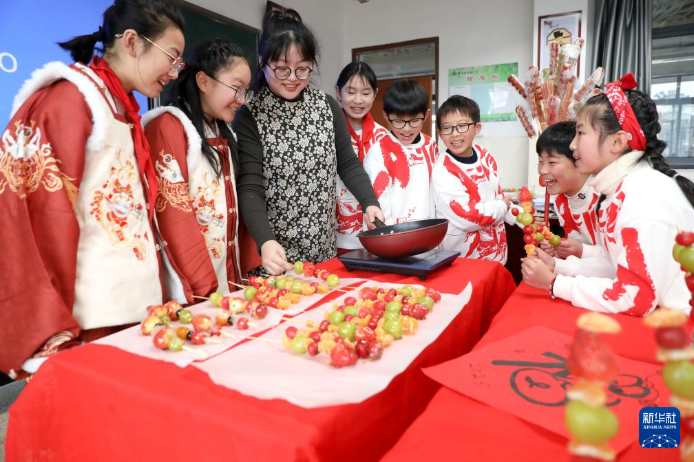 12月30日,在浙江省杭州市桐庐县迎春小学举行的迎新年活动中,老师在指导学生制作糖葫芦。