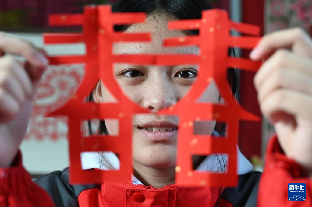 12月30日,在四川省内江市东兴初级中学校,剪纸社团的成员展示迎新年剪纸作品。