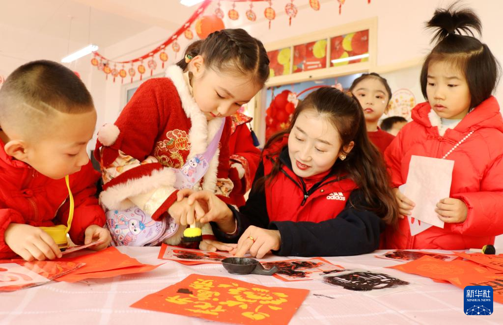 12月30日,在甘肃省平凉市静宁县第一幼儿园,老师在指导孩子们拓印年画和福字。