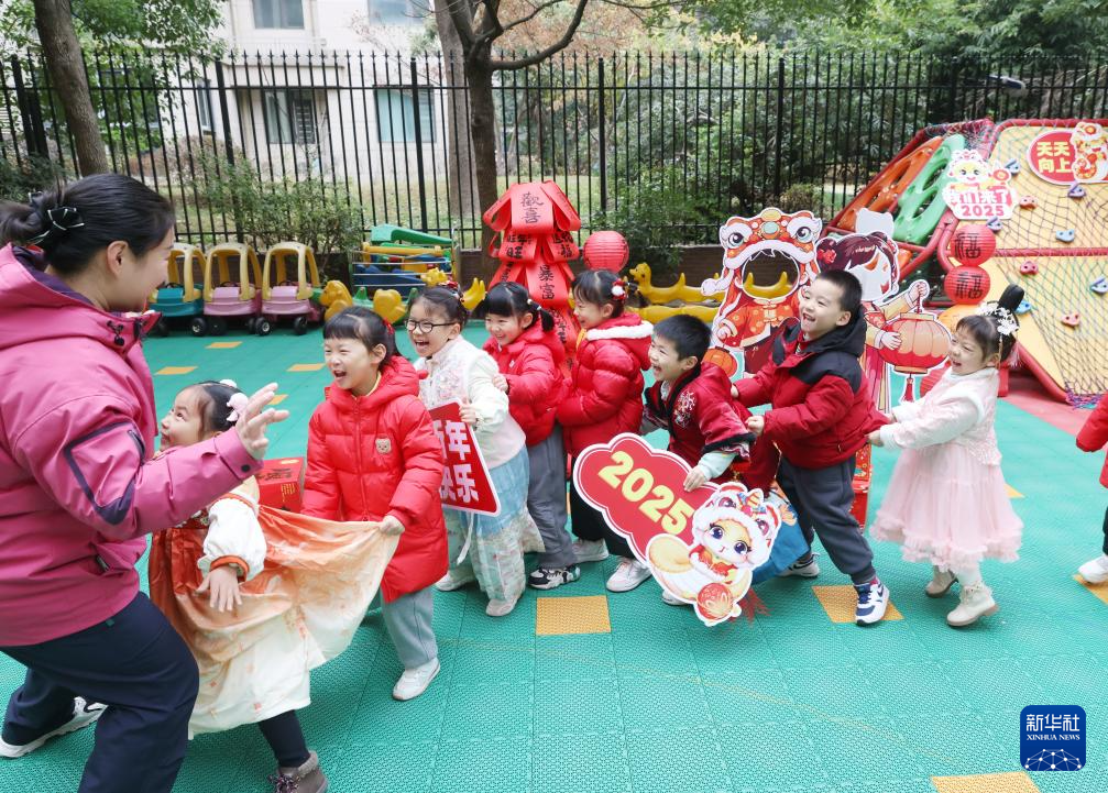 12月30日,湖北省武汉市洪山区实验寄宿幼儿园教师带领孩子进行“迎新年送祝福”的游戏活动。