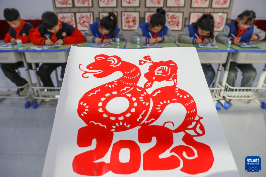 12月30日,河南省平顶山市宝丰县山河路小学的学生在参加剪纸迎新年创作活动。