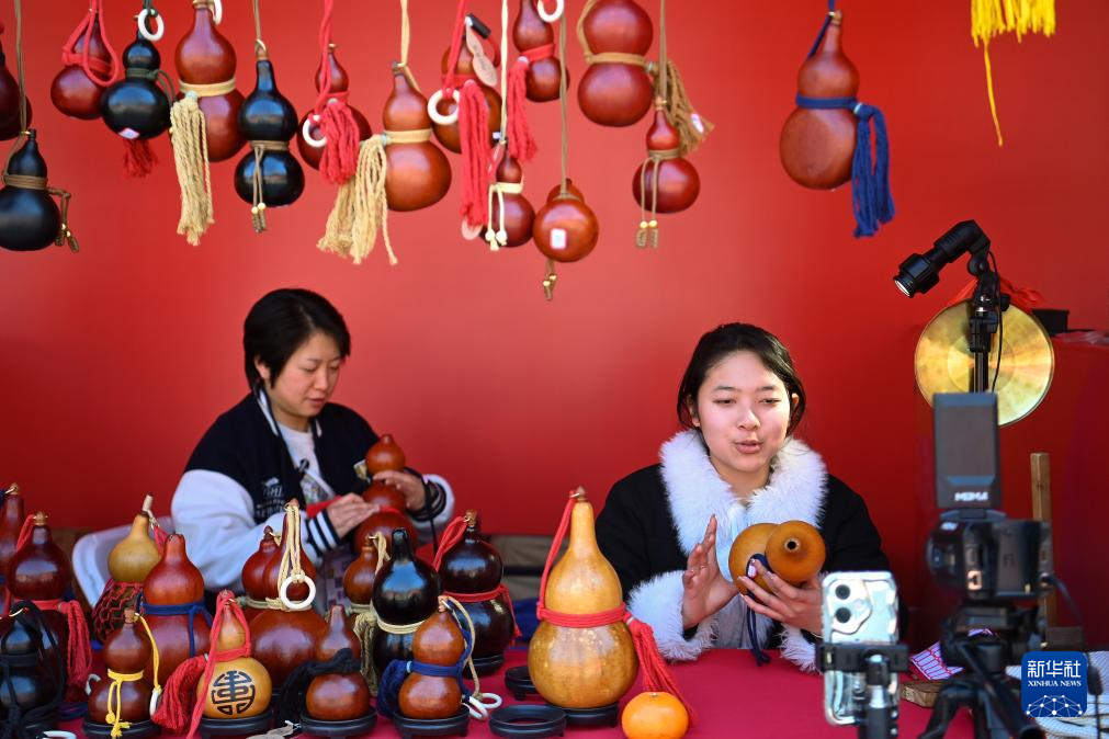 1月8日,传统酒葫芦工艺匠人在西安大唐芙蓉园内的非遗年货集市上直播带货。