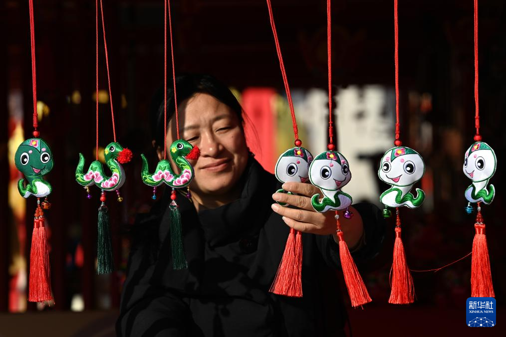 1月8日,在西安大唐芙蓉园内的非遗年货集市上,太原市娄烦县雪梅刺绣非遗传承人尹艾仙整理刺绣挂件。