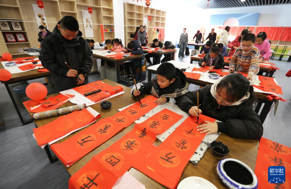 1月22日,在甘肃省定西市博物馆开展的“灵蛇引笔墨,春联送祝福”主题社教活动中,学生们在写春联。