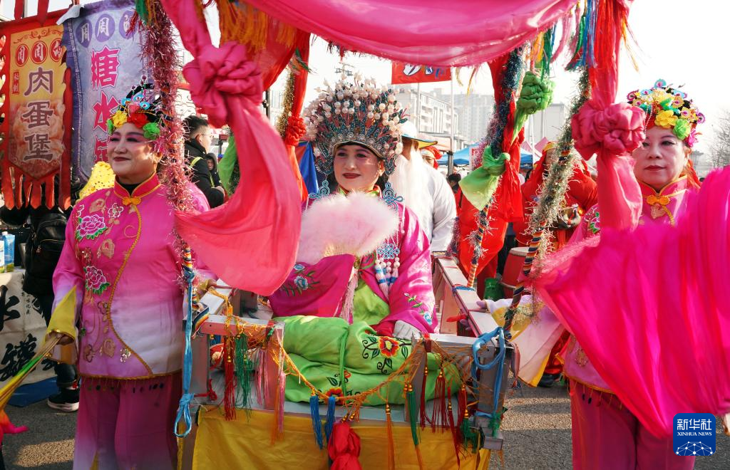 1月22日,在山西省运城市夏县,一支表演队在表演抬花轿民俗社火节目。