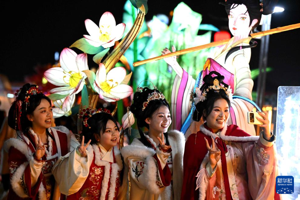 1月23日,游客在河南省开封市清明上河园景区观赏彩灯造型景观。