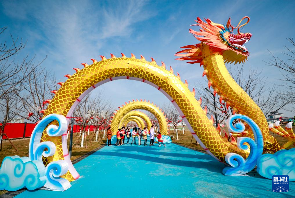 1月23日,在江苏省兴化市莲溪湖公园,一群小朋友在龙灯下玩耍。
