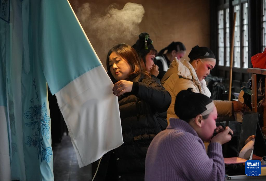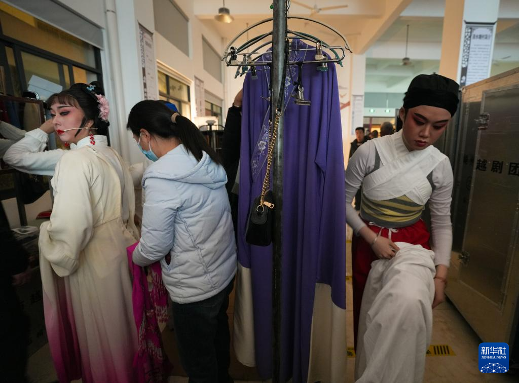 在绍兴市柯桥区夏履镇莲增村,民间越剧团晶蕾艺术团的演员在为表演越剧《五女拜寿》做准备(1月25日摄)。