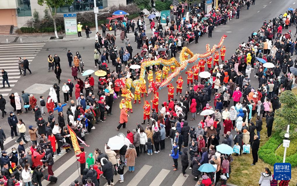 2月12日,龙舞队在泸县街头巡游(无人机照片)。