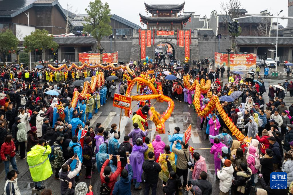 2月12日,市民和游客在张家界市永定区观看巡游演出(无人机照片)。