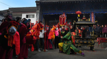 2月11日,建德婺剧团演员在金华市金东区鞋塘办事处金家村为村民演出婺剧经典剧目《五世请缨》。