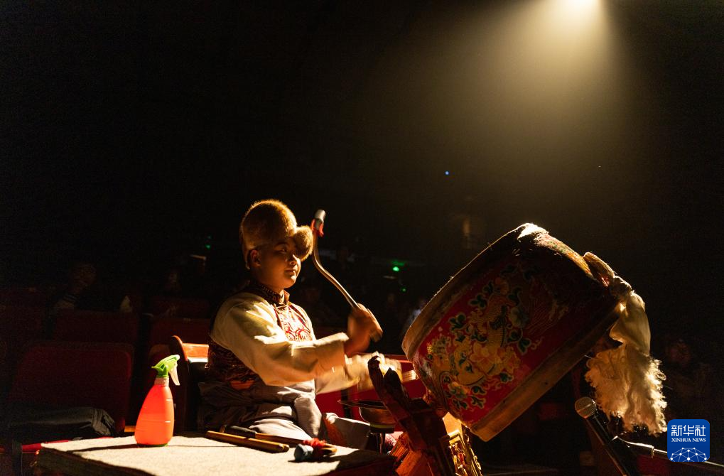 小演员敲锣打鼓为藏戏表演伴奏(2月11日摄)。
