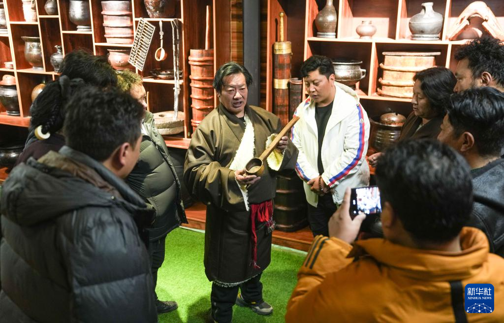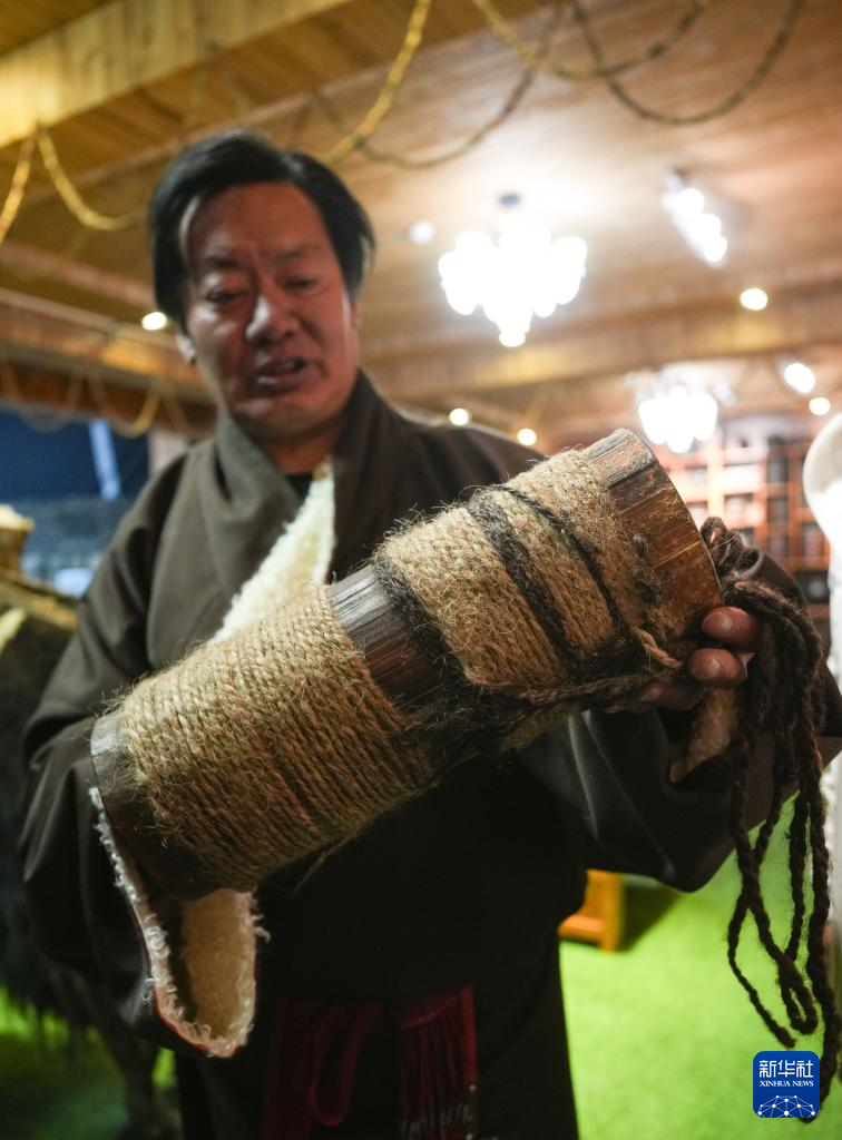 当地民俗专家贡布洛旺在“牧人宝库”藏式茶馆展示挤羊奶用的木桶(2月13日摄)。