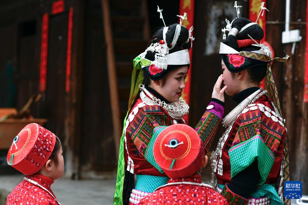 在贵州省凯里市舟溪镇舟溪村茶林苗寨,长辈在帮助双胞胎姐妹杨柠羽(左一)、杨柠竹(左三)穿戴苗族盛装(2月15日摄)。