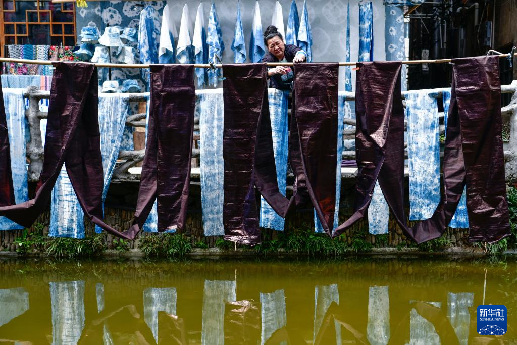 3月18日,村民在贵州省黎平县肇兴侗寨里晾晒侗布。