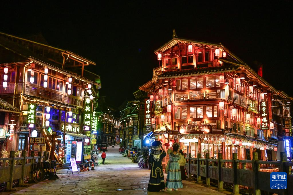 灯火辉煌的贵州省黎平县肇兴侗寨街道夜景(3月17日摄)。