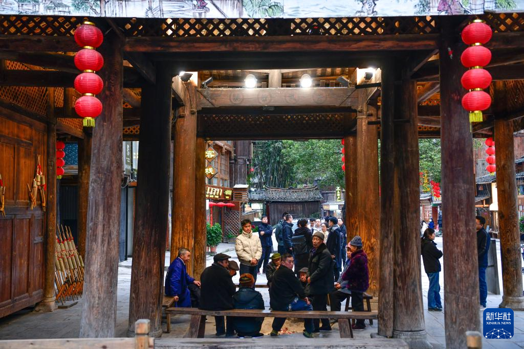 3月17日,村民们围坐在贵州省黎平县肇兴侗寨信团鼓楼里聊天。