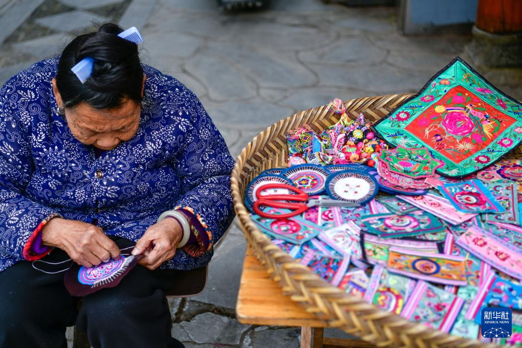 3月18日,村民在贵州省黎平县肇兴侗寨里刺绣。