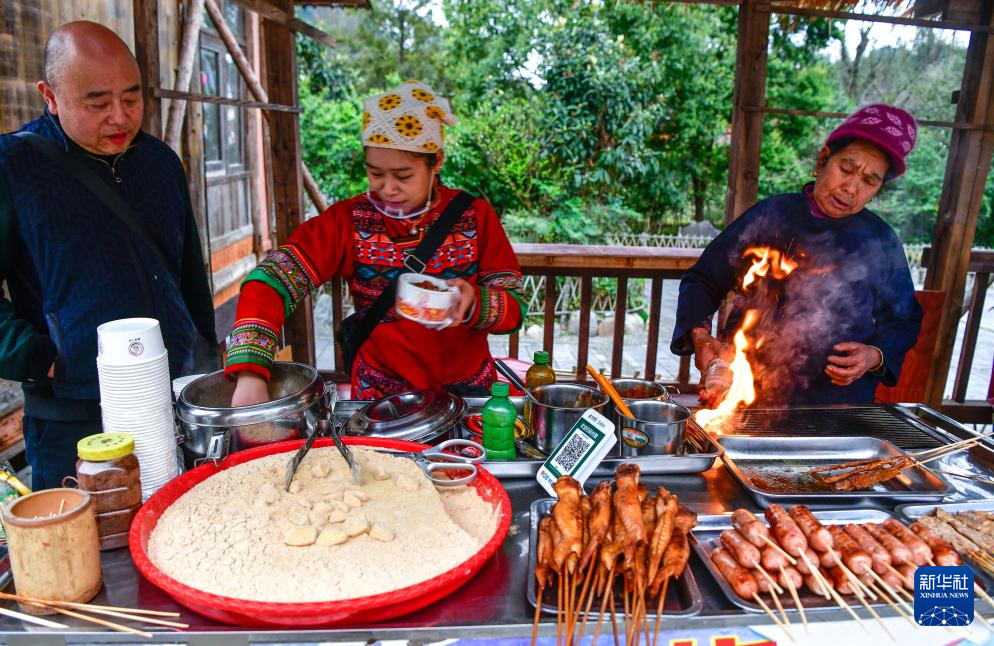 3月17日,村民在贵州省黎平县肇兴侗寨给游客制作当地美食——糯米饭和烤五花肉。