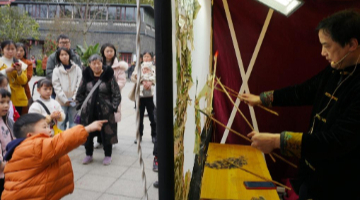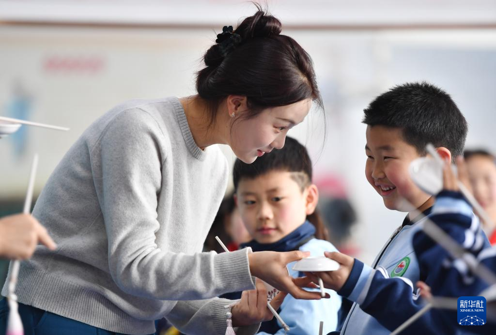 3月18日,常德丝弦艺术剧院“90后”青年演员代表谢颜竹在常德市鼎城区花船庙小学教孩子们学习常德丝弦。