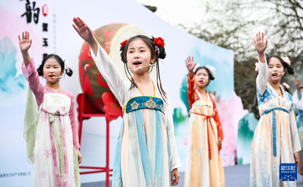 3月22日,小朋友在重庆璧山“儒雅璧韵·璧玉唐礼”传统文化礼仪展示活动现场表演歌舞。
