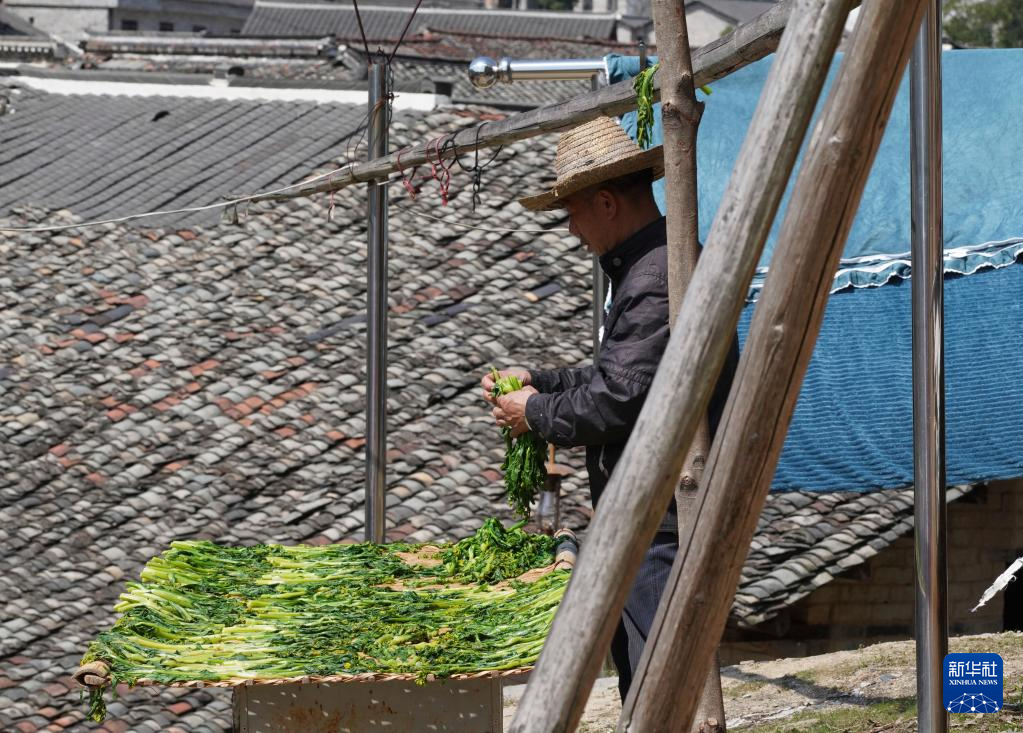 张谷英村村民在院落里晾晒蔬菜(3月21日摄)。