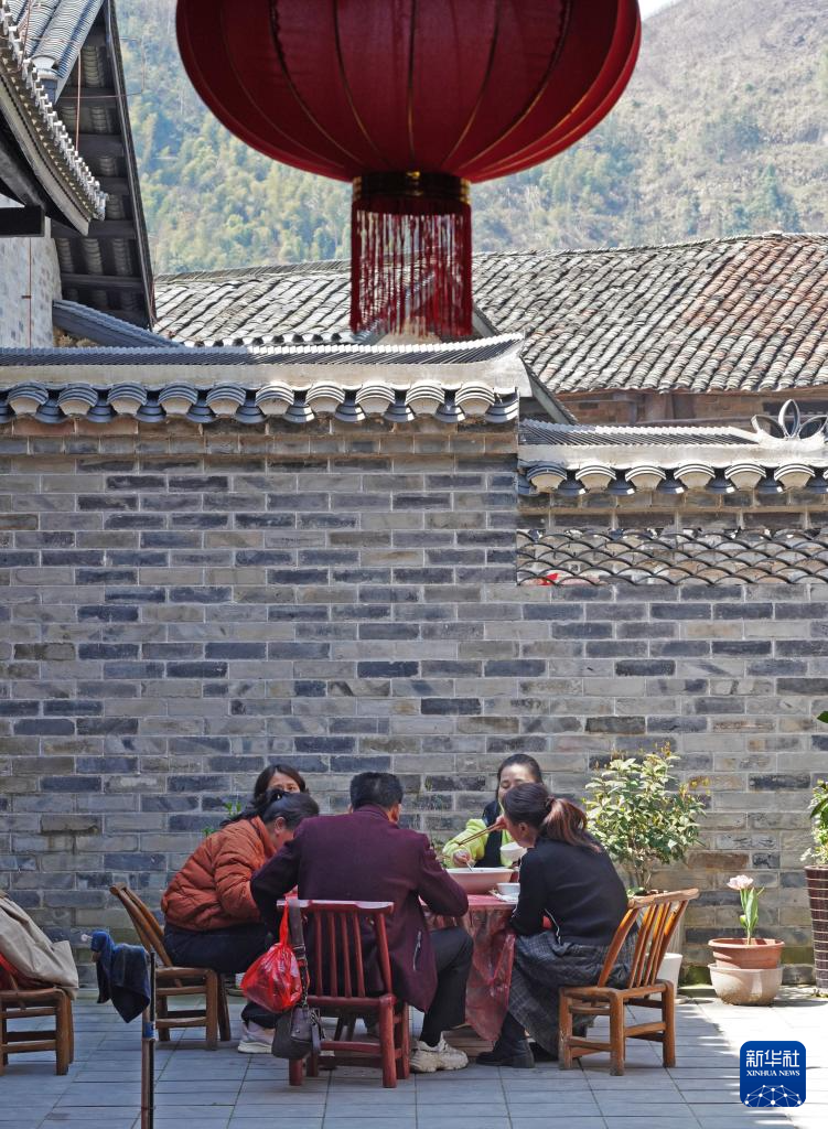 游人在张谷英村一家农家乐里吃午饭(3月21日摄)。