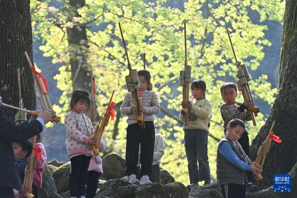 3月28日,广西柳州市融水苗族自治县杆洞乡乌英苗寨教学点的孩子们在练习吹芦笙。
