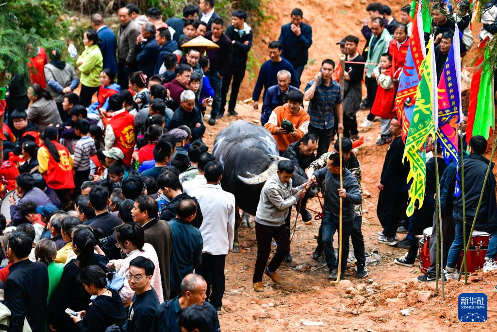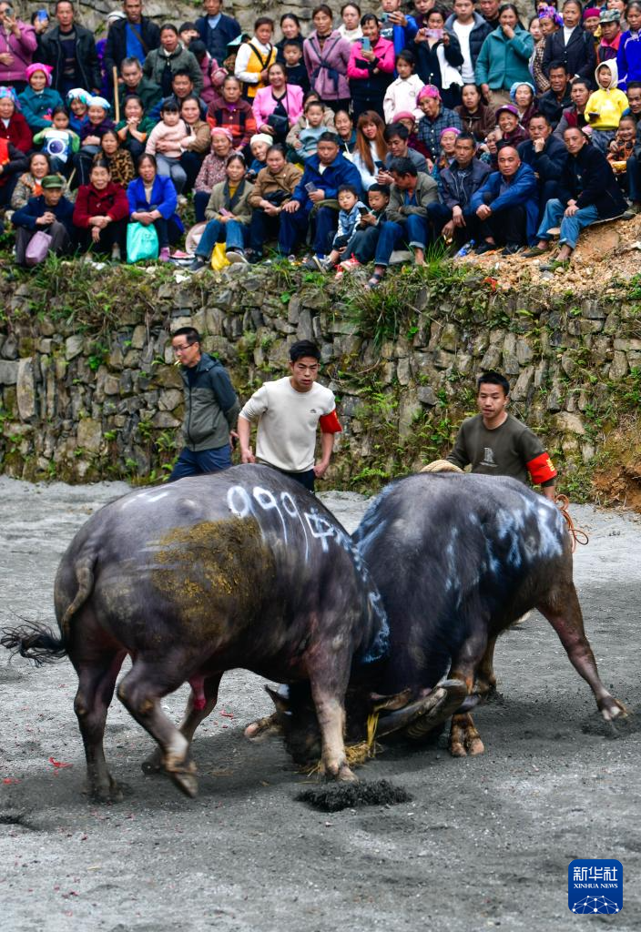 当日,贵州省黔东南苗族侗族自治州锦屏县固本乡举办2025年新民片区三月初九牯藏节斗牛民俗活动,来自各苗乡侗寨的人们齐聚斗牛塘,斗牛欢庆牯藏节。