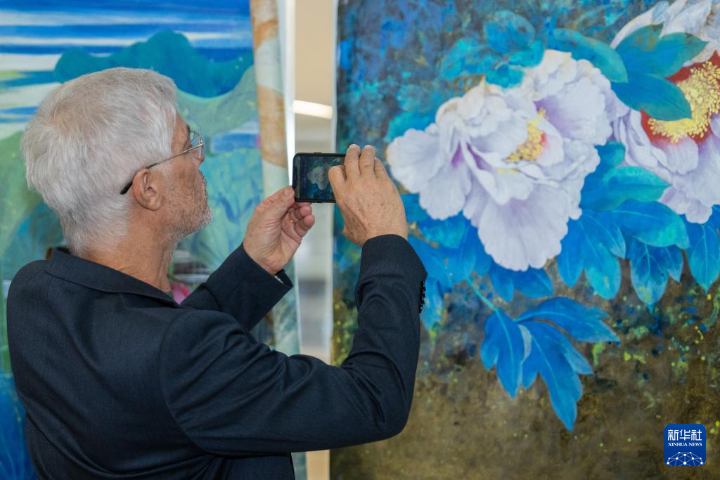 4月9日,在巴西戈亚斯州首府戈亚尼亚,一名观众拍摄中国花鸟工笔画。