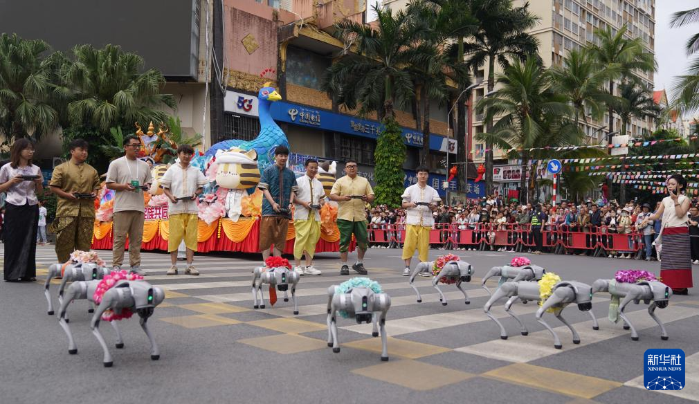 4月14日,人们操控机器狗在民族民间传统文化大游演现场表演。