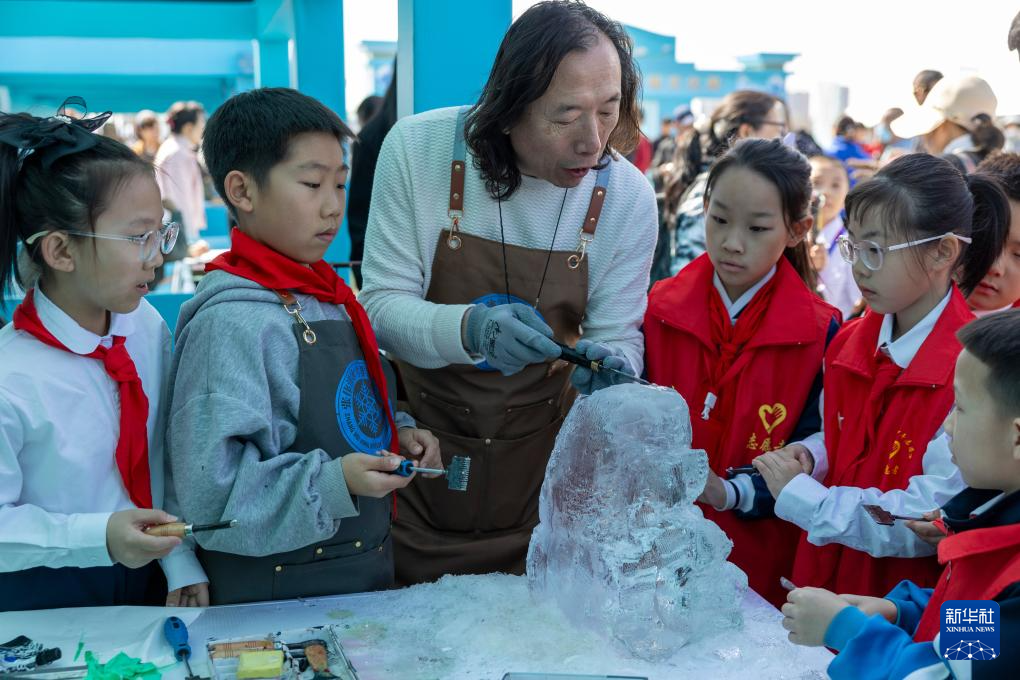 4月16日,非遗传承人在2025哈尔滨市开江民俗文化周启动仪式现场展示冰雕技巧。