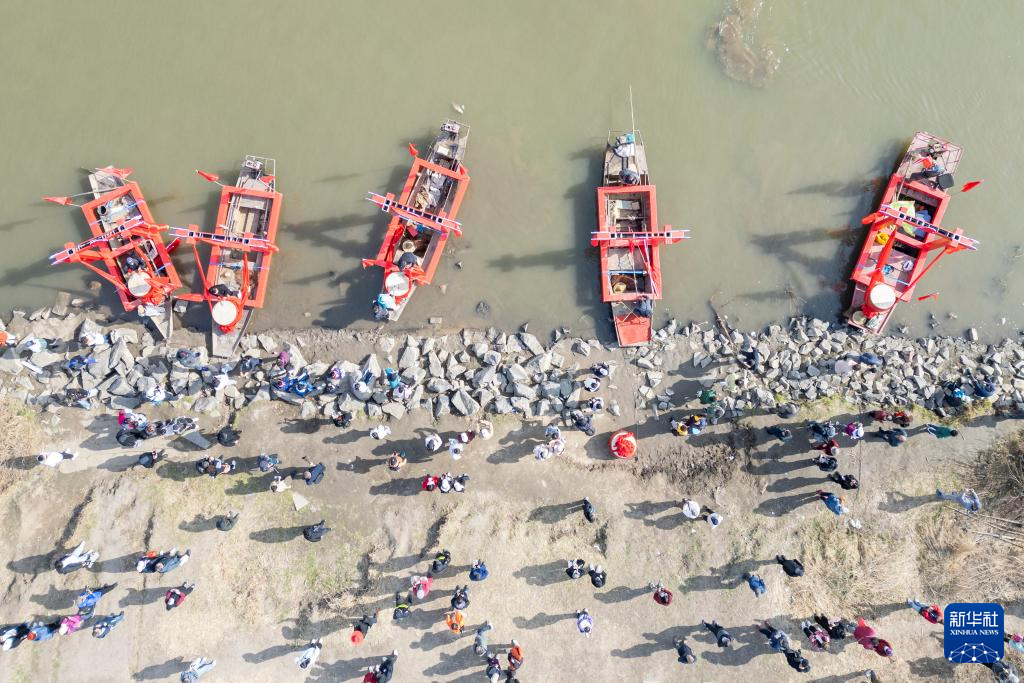 4月16日,人们在2025哈尔滨市开江民俗文化周启动仪式现场参观开江捕鱼的船只(无人机照片)。
