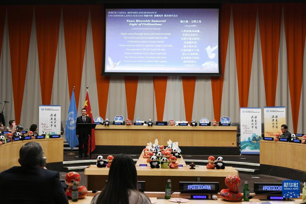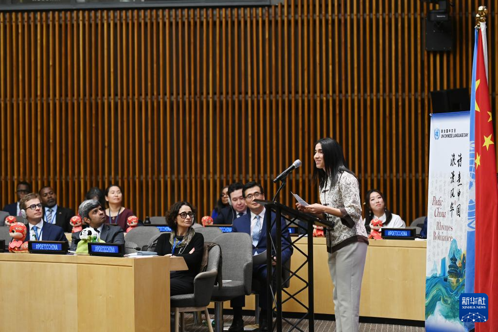 4月15日,在位于纽约的联合国总部,中国常驻联合国代表团青年外交官在2025年联合国中文日活动上朗诵由深度求索(DeepSeek)生成的《临江仙·文明之光》。