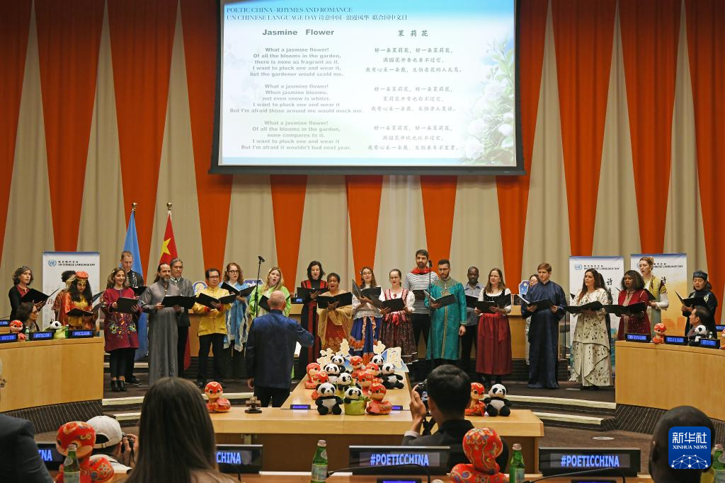 4月15日,在位于纽约的联合国总部,联合国合唱团成员在2025年联合国中文日活动上演唱中国民歌《茉莉花》。