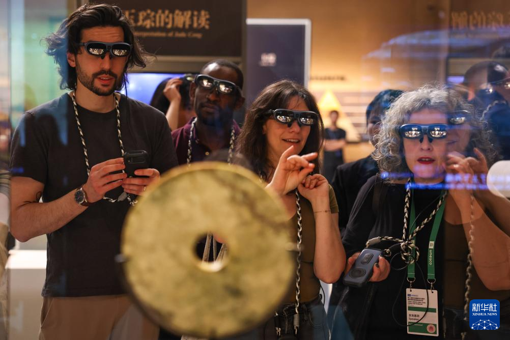 4月23日,参加论坛的嘉宾使用AR(增强现实)眼镜参观良渚博物院展品。