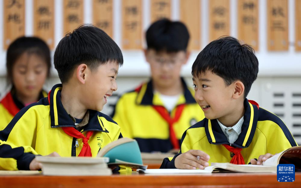 4月23日,在山东省枣庄市市中区文化路小学,两名学生在校园书吧里阅读时相互交流。